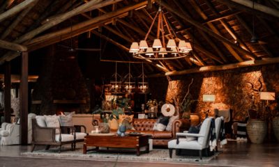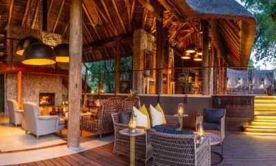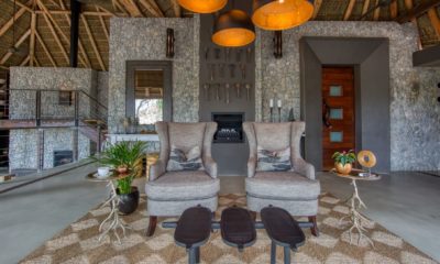 Le lodge principal, resplendissant avec ses divans profonds et ses accents africains contemporains, s’ouvre sur la véranda et sur la nature sauvage.