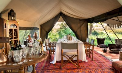 Les deux espaces communs se composent chacun d’une grande tente ouverte sur les côtés. Dans l’une se trouve la salle à manger, tandis que l’autre abrite le salon, qui, avec d’énormes coussins, tapis et coffres zanzibari, lampes en laiton, tables basses, rappellent l’époque des grandes explorations !