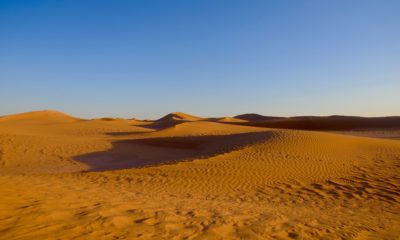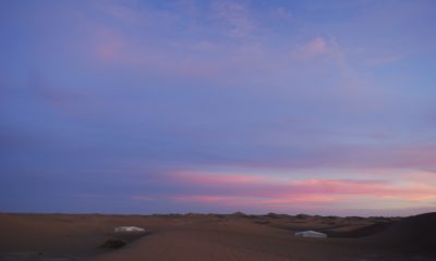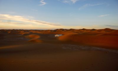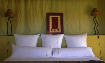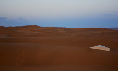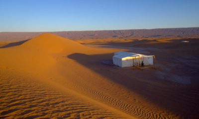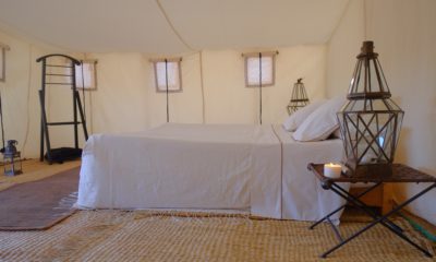 Les tentes sont nichées aux creux de dunes ocre. Le campement est d’un luxe inouï, avec un grand lit d’hôtel, vasque de paquebot, babouches à pompons.