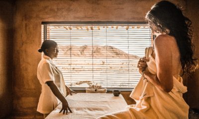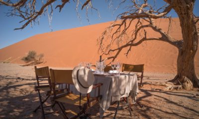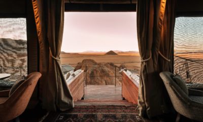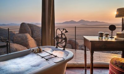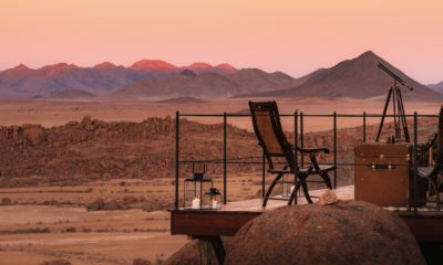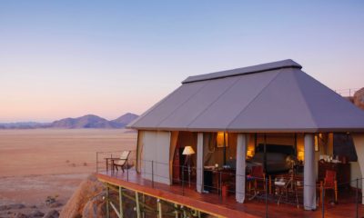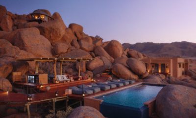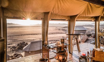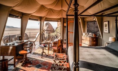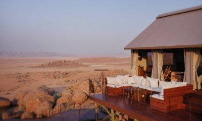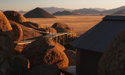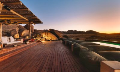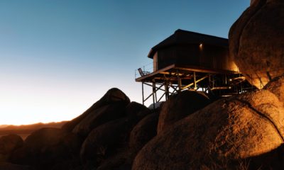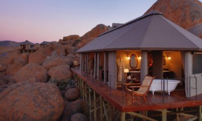 Le lodge sur pilotis, tout droit sorti de Out of Africa, au milieu d’une mer de sable rougeoyante au soleil, surgit comme un mirage d’improbables joyaux de granit volcaniques.