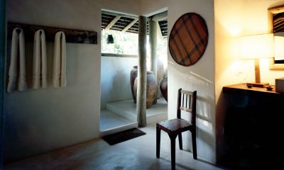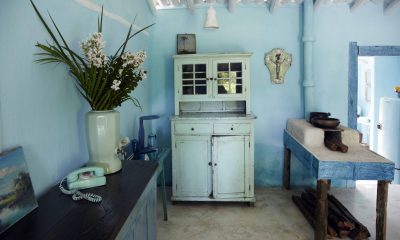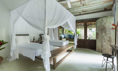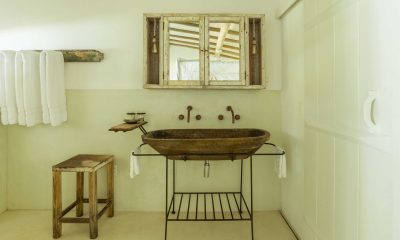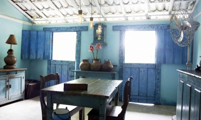 A l’intérieur, les lits à baldaquins côtoient les objets d’art de Bahia, alors que s’unissent branches tressées, sisal, toile de bâche, coton, bois grisé, argile et ibre de coco…