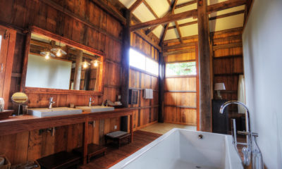 Les salles de bains sont vastes, lambrissées de bois exotique et équipées d’une douche pluie. Les espaces communs offrent des lignes épurées et contemporaines et jouent le contraste avec les maisons traditionnelles.