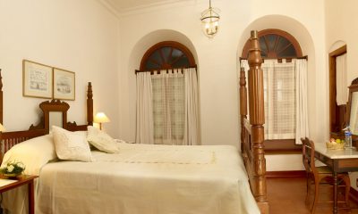 A l’intérieur des chambres, le mobilier provient des antiquaires du Kerala, judicieusement sélectionnés afin d’évoquer ce passé glorieux.