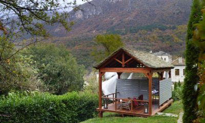 Savourez des plats typiques de la Grèce du Nord sur le patio du pavillon tout en admirant les vues panoramiques sur les falaises rocheuses imposantes et les vallées fluviales verdoyantes.