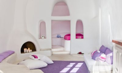 Le décor est d’un pur minimalisme cycladique. Au lieu du bleu et blanc grec classique, les « grottes » pâles et fraîches sont égayées de touches de lilas et de rose vif. Des lits bas sont placés dans des alcôves avec des fenêtres en arc qui encadrent la vue ; des oreillers géants sont disposés avec parcimonie sur des sols en béton lisse ; et des brins de bougainvilliers égayent les salles de bains voûtées. Il y a huit types de chambres différents ; en sachant que la plus haute catégorie de chambre possède sa propre piscine, son hammam et sa terrasse privée. Il n’y a pas de télévision – la caldera est tout ce dont vous aurez besoin pour vous divertir. .